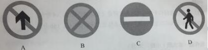 25、交通标志已经成为现代生活的一部分。在保证道路交通安全、顺畅方面有着重要作用。分为主标志和辅助标志两大类。主标志包括禁令标志、警告标志、指路标志、指示标志等。下列选项中,表示“禁止直行”的标志是(    )